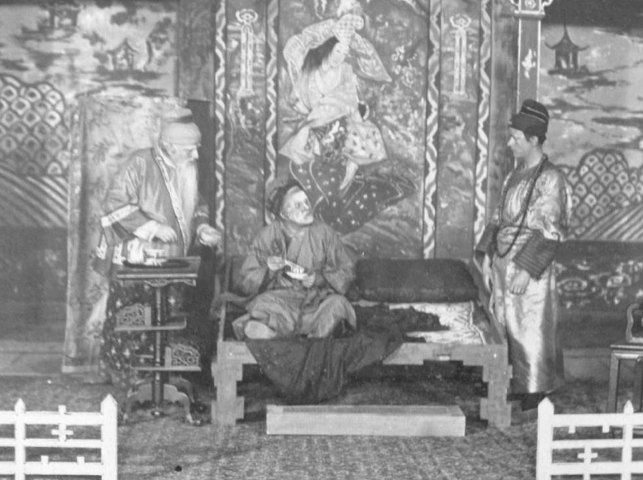 Pour les pièces exotiques, l’accent est mis avant tout sur la vraisemblance géographique. Malgré la progression des tenues occidentales dans les pays asiatiques (Japon en tête), les représentations des pièces de théâtre mettent toujours en scène des tenues traditionnelles, c’est-à-dire typiquement extrême-orientales. L’utilisation de véritables costumes orientaux constitue un gage de vraisemblance supplémentaire. Pour L’Avare chinois, certains costumes proviennent de la collection personnelle de Judith Gautier et sont d’authentiques tenues chinoises. Il en est de même pour les bijoux dont un collier en pierres précieuses. Les autres costumes ont été réalisés d’après ceux exposés au musée Guimet [16]. Une photo de la pièce dévoile la diversité des costumes : robe soyeuse et colorée ou unie et plus simple suivant les personnages, turban en couvre-chef et collier.